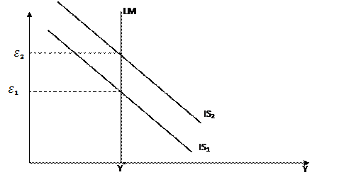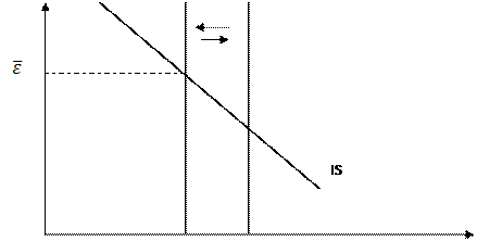 Рис. 12.5. Модель Монделла-Флемінга в координатах На рис. 12.5 крива IS має від’ємний нахил оскільки відображає зворотну залежність між валютним курсом і ВВП. Крива LМ буде вертикальною оскільки при r=w рівновагу на грошовому ринку визначає дохід незалежно від обмінного курсу. Модель використовується для пояснення впливу макроекономічної політики на дохід у короткостроковому періоді. Стимулююча фіскальна політика у відкритій економіці при плаваючому обмінному курсі буде відображатися графічно у зрушенні кривої IS1 вправо до ІS2 (рис. 12.6.)