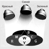 Рис. 1.1. Принцип действия аддитивной цветовой модели RGB. Путем проекции трех цветов: красного, синего и зеленого на светлую поверхность можно получить большинство цветов видимой области спектра. При одновременном смешивании трех чистых цветов получается белый цвет