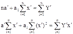параболічна залежність Y = a0 + a1х2. Замінюємо х2 = х′ і отримаємо лінійну модель Y = a0 + a1х′. Для оцінки теоретичних параметрів моделі складаємо систему нормальних рівнянь: