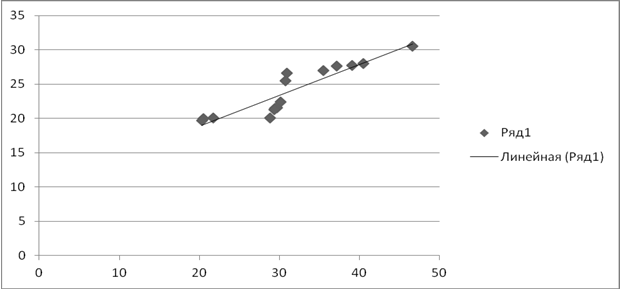 Розрахунок аналітичної залежності та параметри моделі лінійної моделі проведемо за допомогою середовища EXCEL, застосуємо для цього вбудовану функцію ЛИНЕЙН» Результат – це оцінка параметрів лінійної регресії та регресійна статистика. Для цього треба: 1) відмітити поле, де буде знаходитись результат розміром (k + 1) ´ 5, або m1 ´ 5; m1 = k + 1 2) ввійти у «майстер функцій f». У категоріях вибираємо " статистична", а в функціях – ЛИНЕЙН. Вводимо адреси значень Y, Х та значення константи і статистики; 3) для того, щоб отримати на екрані результат, натискаємо спершу клавішу F2, а потім Ctrl+Shift+Еnter. Функція може додатково обчислювати регресійну статистику «Відомі значення Y» — множина значень Y. Якщо масив Y має один стовпець, то кожний стовпець масиву «відомі_значення_Х» інтерпретуються як окрема змінна. Якщо масив «відомі_значення_Y» має один рядок, то кожний рядок «відомих значень Х» інтерпретується як окрема змінна. «Відомі_значення_Х» — множина значень Х, що враховує або одну (парна регресія), або кілька змінних (множинна регресія). Якщо «відомі_значення_Х» пропустили, то вважається, що це масив {1; 2; 3;...} такого самого розміру, як n «відомих_значень Y». «Конст» — логічне значення. Якщо «конст» має значення «ложь», то a 0 беруть таким, що дорівнює нулю: значення aдобирають так, щоб виконувалася рівність Y = ХА (модель без вільного члена). Якщо «конст» має значення «истина», то a 0 обчислюється традиційно (модель з вільним членом). «Статистика» — логічне значення, яке вказує, чи потрібно обчислювати додаткову статистику за регресією. Якщо «статистика» має значення «истина», то функція ЛИНЕЙН обчислює додаткову регресійну статистику у вигляді масиву. Де а1 - оцінка параметра; а0 - оцінка вільного члена регресії; Sa1 – стандартна похибка оцінки параметра а1; R2 - коефіцієнт детермінації; sey – стандартна похибка залишків; F – критерій Фішера Ступінь свободи дорівнює (n – m), де n – кількість спостережень, m – кількість змінних у моделі; це значення необхідне для визначення табличного значення F-критерію. Ssreg - сума квадратів відхилення, що пояснюється регресією; ssresid – сума квадратів відхилення, що пояснюється похибкою u. Лінійна залежність має вигляд: Y = -1, 8132х+24, 853.