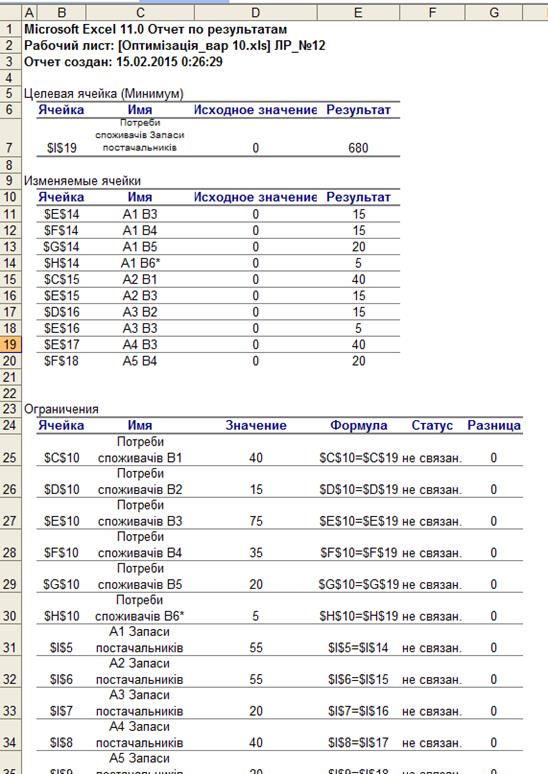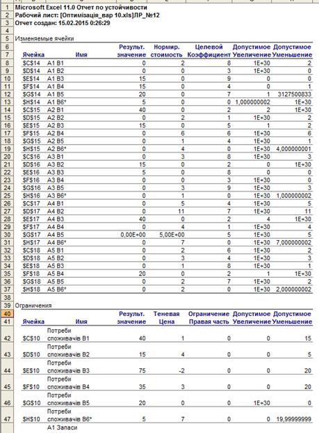 Рис. 12.8. Коротко за звітом по стійкості (рис. 12.9). Показник нормована вартість, показує як зміниться цільова функція при примусовому збільшенні на одиницю j-го виду споживання. Цей звіт показує, що транспортування сировини на завод № 1 та на завод № 2 є вигідним.