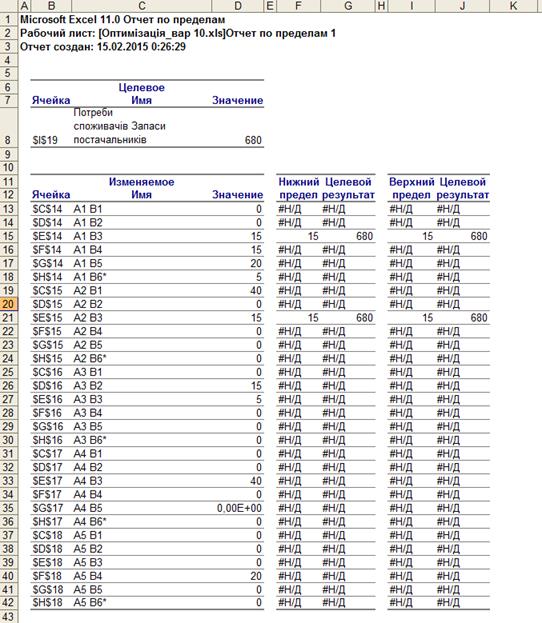 Звіт по границям (рис. 12.11). У ньому показано, у яких межах може змінюватися постачання сировини, що ввійшла в оптимальне рішення, при збереженні структури оптимального рішення: