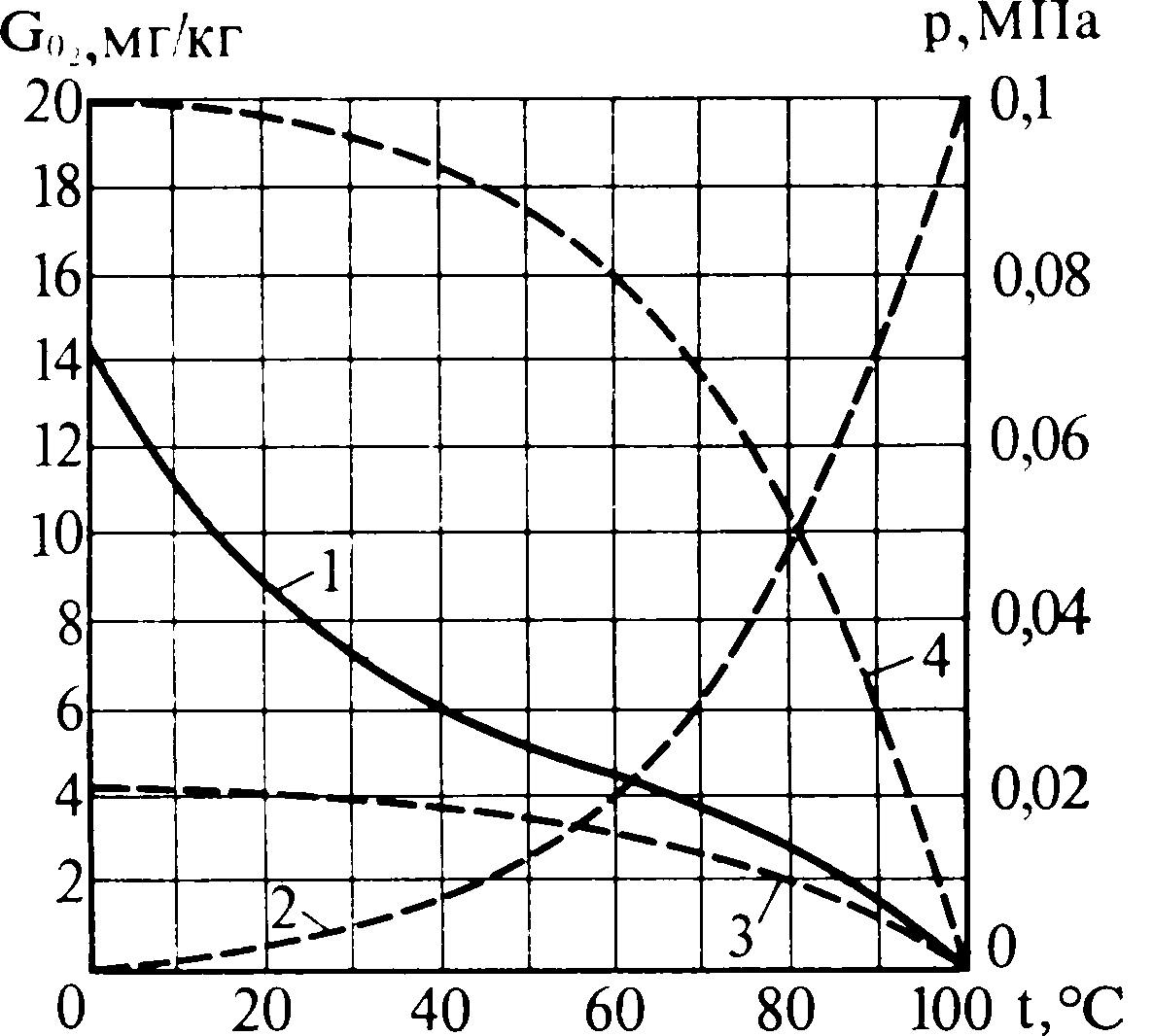 1 - вміст оксигену у воді; 2 - парціальний тиск водяної пари; 3 - парціальний тиск оксигену; 4 - парціальний тиск повітря.
