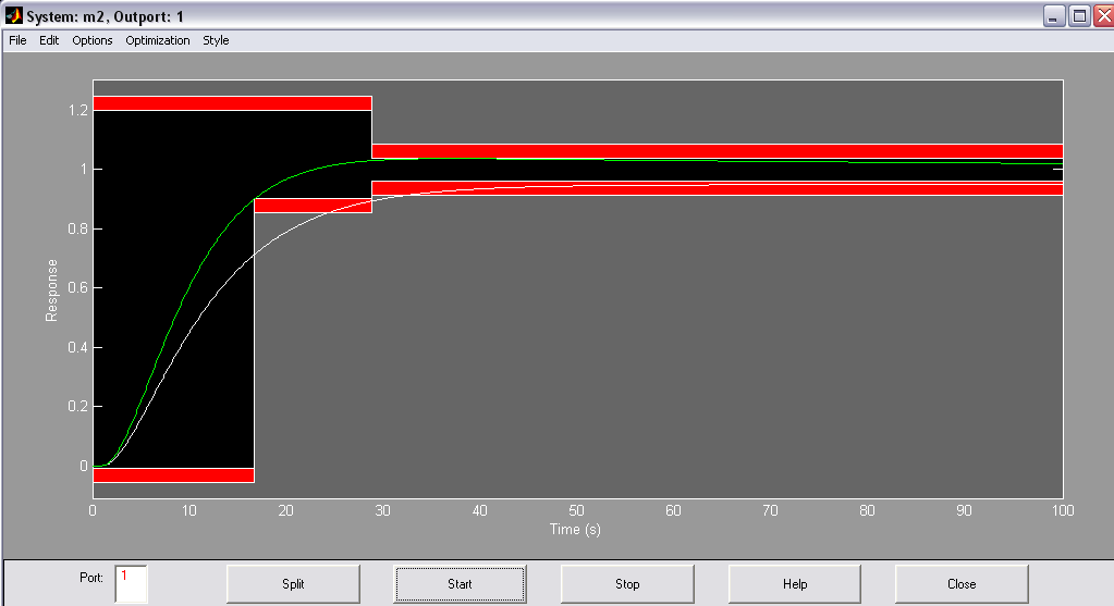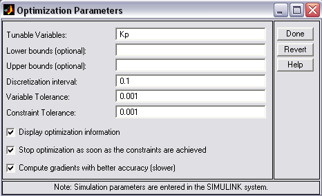 Задання динамічних обмежень здійснюється у візуальному режимі. На базі цих обмежень NCD-Blockset автоматично генерує задачу кінцевомірної оптимізації так, щоб точка екстремуму в просторі параметрів, які настроюються, відповідала виконанню всіх вимог, що ставляться до якості процесу. Ця задача вирішується із застосуванням спеціалізованої процедури квадратичного програмування із пакета Optimization Toolbox. Хід оптимізації контролюється на екрані з допомогою відображення графіка контрольованого процесу і поточних значень функції, що мінімізується. При завершенні процесу його результат фіксується в робочому просторі. Задача оптимізації полягає в тому, щоб вибрати такий коефіцієнт передаточної функції П – регулятора, який би забезпечував вказані вимоги до якості перехідного процесу.Параметри блоку Kp задамо змінною величиною, а саме: Kp.У командному вікні MatLab задамо початкові значення змінних: Kp=1.