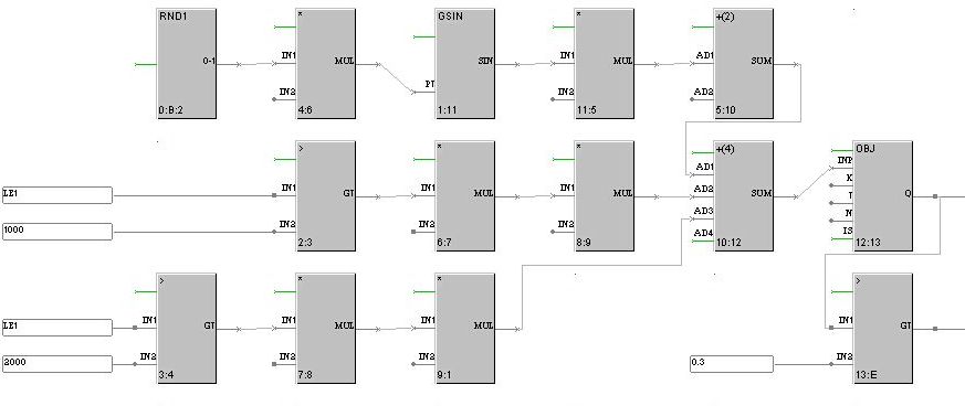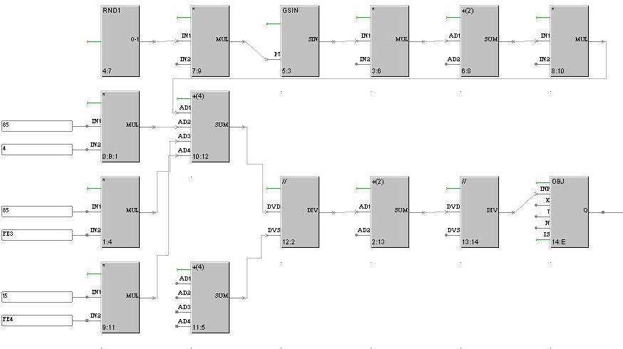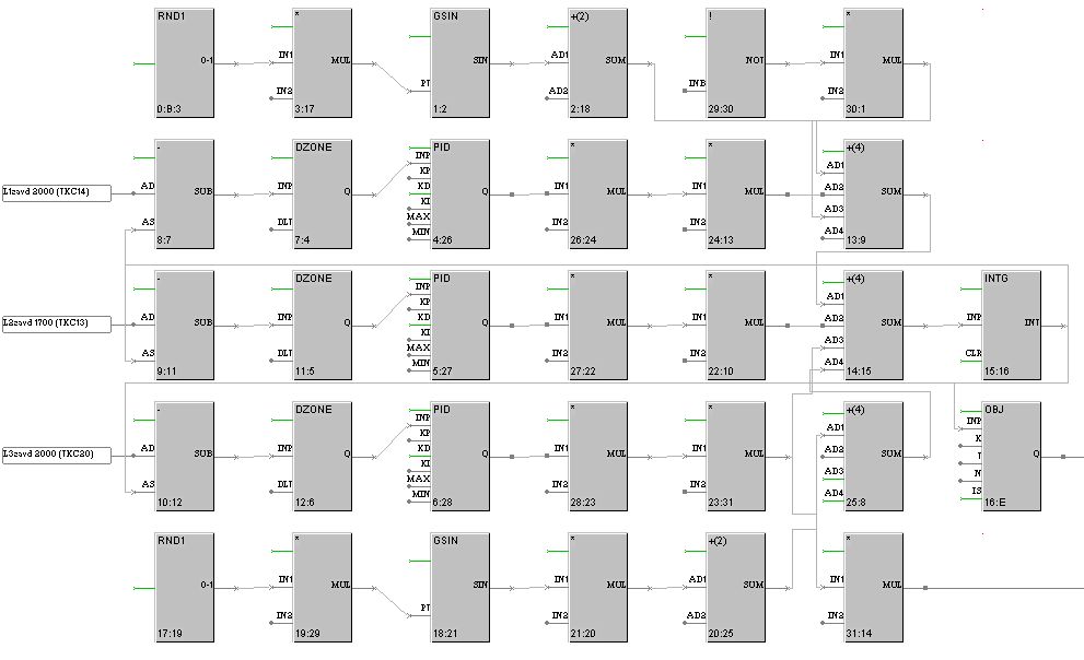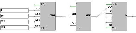 Приведена FBD-програма складається із двох частин. Перший і п’ятий рядок блоків програми емулюють коливання витрати води в деаераторі; другий - четвертий рядки блоків представляють собою власне регулювання з PID-регулятором, на виході якого формується керуючий сигнал. Програма для регулювання витрати підживлюючої води при введені бору.
