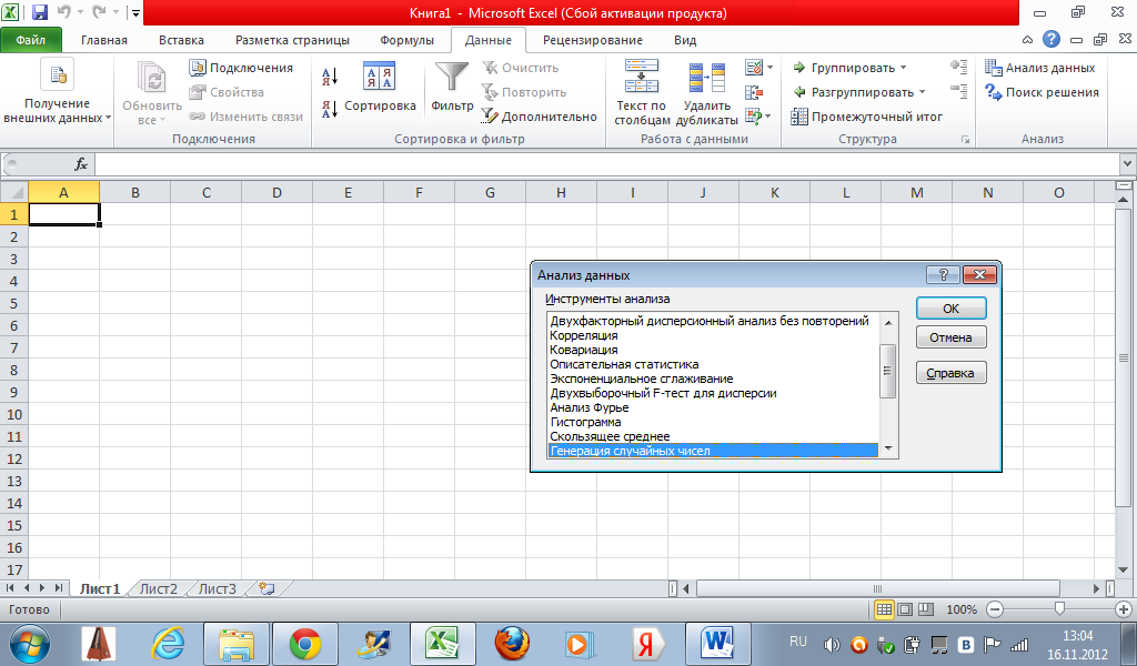 Для получения значений случайной величины Х с показательным законом распределения Для моделирования значений СВ Y используем инструмент Генерация случайных чисел в MS Excel Пакет анализа. При вызове этой надстройки (Данные/ Анализ данных) появляется диалоговое окно Анализ данных, содержащее список инструментов анализа: