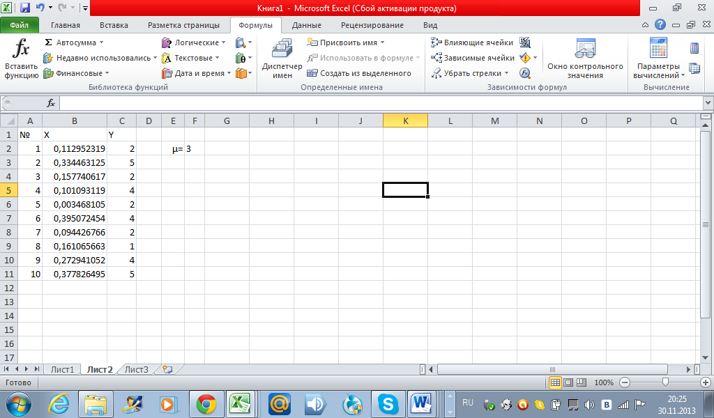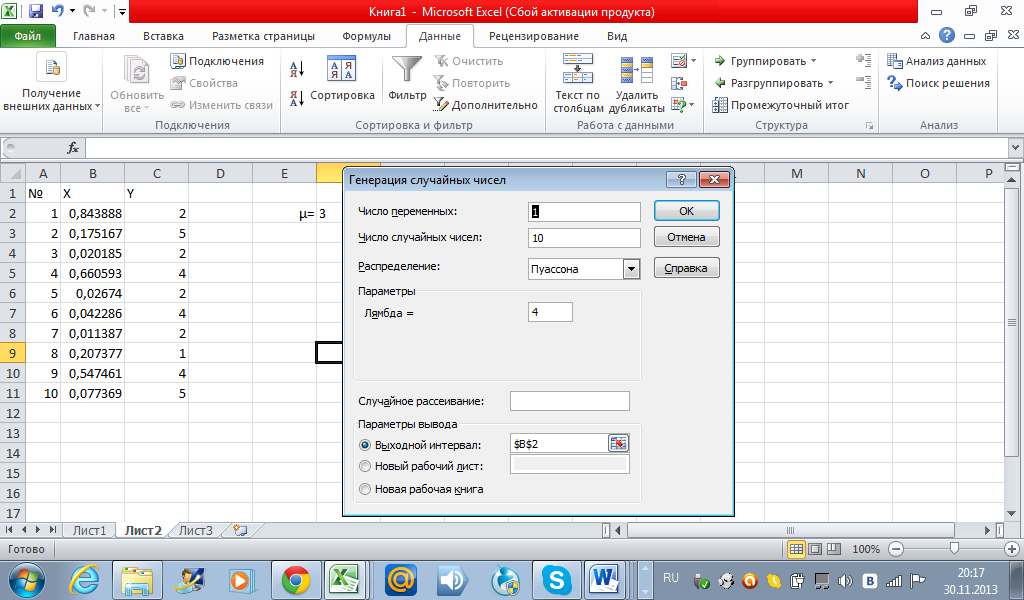 Рассматриваемая надстройка позволяет использовать семь типов распределений: равномерное, нормальное, Бернулли, биномиальное, Пуассона, модельное и дискретное. Заполним его для распределения Пуассона, задавая количество чисел -10 и значение λ = 4 и ячейку для вывода значений СВ Y. В итоге получим два столбца для Х и Y.