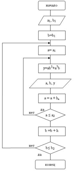 Рис.8 Пояснения к блок-схеме (рис.8): 1. Аргументам а и b функции y присваиваются начальные значения диапазона изменения аргументов a1 и b1; 2. Вычисляется значение функции у; 3. Вывод на экран аргументов a, b и функции у; 4. Аргументам функции a и b прибавляются их приращения ha и hb; 5. Проверяются условия окончания циклов a≤ a2 и b≤ b2. Действия выполняются до тех пор, пока не будут достигнуты конечные значения диапазонов изменений аргументов a и b.