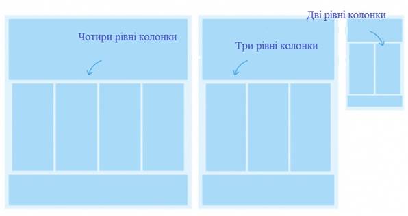 Рисунок 2.1 Зображення блоків сайту на різних мобільних пристроях За допомогою простої сітки з однаковою шириною колонок ми змогли простим чином спланувати положення компонентів при зменшенні ширини екрану. Створюємо головний шаблон. При створенні кожного каркаса сайту варто враховувати кількість колонок і як компоненти будуть розташовуватися за умови, що ширина сторінки скорочується. Наприклад, що відбудеться, якщо місця виявиться ще менше. Або якщо зробити 4 колонки контенту. Або якщо скоротити кількість колонок до трьох штук. На всіх етапах розробки дизайнер і проектувальник повинні працювати разом, щоб мати можливість співвідносити всі моменти, що стосуються візуальної зміни сайту і CSS-параметрів. Починаємо з домашньої сторінки, так як я вважаю що домашня сторінка є найголовнішою, вирішальною. Нижче показаний вже готовий каркас сторінки. Як ви бачите, довжина мобільної версії сайту трохи більше за рахунок того, що вміст розтягується в одну колонку.
