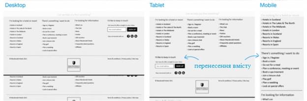Рисунок 2.4 Зображення нижньої частини сторінки на різних мобільних пристроях Інші компоненти. Наша спрощена сітка дозволила досить просто спланувати розташування компонентів. На головній сторінці ми додали горизонтальну прокрутку, яка одним клацанням прокручує сторінку. Варіант сайту для планшета зберігає цю функцію, але робить видимими тільки три пункти, а в мобільному варіанті ми попросту прибрали цю функцію і розташували всі елементи вертикально. Кожен з компонентів може потребувати окремого підходу, тому продумайте, як користувач зможе користуватися кожним елементом на різних параметрах екранів. Для користувачів мобільних телефонів можливо буде набагато зручніше просто прокручувати сторінку замість того, щоб натискати маленькі кнопки для взаємодії зі сторінкою.