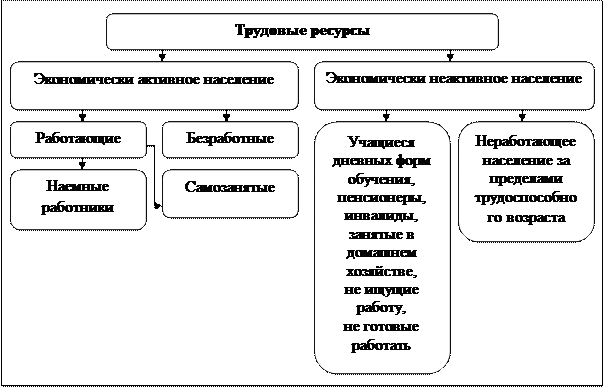 Рис. 7. Структура трудовых ресурсов Показатели изменения численности трудовых ресурсов: 1) абсолютный прирост населения: Ап = Чк – Чн, где Ап – абсолютный прирост, Чк – численность населения в конце периода, Чн – численность населения в начале периода; 2) темп роста населения: Тр = Чк / Чн, где Тр – темп роста населения; 3) темп прироста населения: Тп = Чк / Чн – 1, где Тп – темп прироста населения.