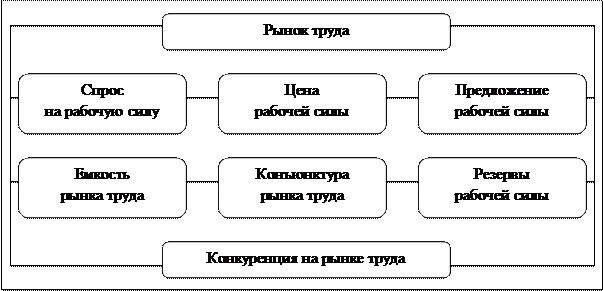 Механизм рынка труда – взаимодействие и согласование разнообразных интересов работодателей и трудоспособного населения, желающего работать по найму, на основе информации, получаемой в виде изменений цены труда. Элементы механизма рынка труда представлены на рис. 11.