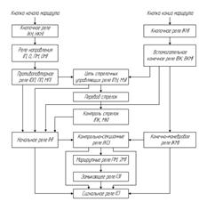 Упрощенный алгоритм работы системы БМРЦ при задании маршрута приведен на рис. 1. На каждую стрелочную и бесстрелочную секцию предусматриваются два маршрутных (1М и 2М) и одно замыкающее (З) реле. Нормально маршрутные и замыкающие реле находятся под током. Установка маршрута производится нажатием кнопок начала и конца. Нажатие кнопок фиксируется кнопочными реле (КН, НКН). Кнопочное реле начала маршрута включает реле направления (П, О, ПМ или ОМ). Реле направления включает соответствующую шину питания, от которой возбуждается противоповторное реле (ОП, ПП, МП). Кнопочное реле конца маршрута от той же шины питания включает вспомогательное конечное или вспомогательное конечное маневровое реле (ВКМ). Противоповторное и вспомогательное конечное маневровое реле включают плюсовые или минусовые стрелочные управляющие реле (ПУ, МУ), которые дают команду на перевод стрелок. После перевода всех стрелок, входящих в маршрут, и получения контроля (включение реле ПК, МК) возбуждается начальное реле (Н), которое определяет начало маршрута в схемах исполнительной группы реле. Возбуждением конечно-маневрового реле (КМ) определяется конец маршрута в схемах исполнительной группы реле. Через контакты начального и конечно-маневрового реле образуется цепь контрольно-секционных реле (КС). Контрольно-секционные реле выключают маршрутные реле, а маршрутные реле выключают замыкающие, контактами которых размыкаются управляющие цепи стрелок. Таким образом осуществляется замыкание маршрута. После выключения замыкающих реле образуется цепь включения сигнального реле (С) устанавливаемого маршрута, которое включает разрешающий огонь на светофоре. Рисунок 1