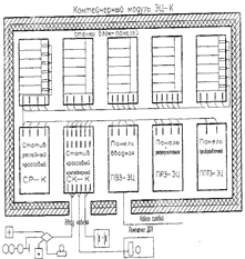 В контейнерных модулях размещается аппаратура ЭЦ и питающие устройства. Пример размещения оборудования водиночном контейнере показан на рисунке 1. В модуле расположены: 5 стенок блок-панелей СБП-К; статив релейный СР-К; статив кроссовый СК-К; вводная панель ПВЗ-ЭЦ; распределительная панель ПРЗ-ЭЦ; панель преобразователей ППТЗ-ЭЦ. Стенка блок-панелей представляет собой раму, на штыри которой навешиваются и крепятся винтами блок-панели с аппаратурой ЭЦ. Разработаны четыре типа блок-панелей. Блок-панель БП-РЭЛ предназначена для расположения на ней реле типа РЭЛ и аппаратуры в габаритах реле типа РЭЛ: Блок-панель БП-НМШ применяется для установки на ней реле типаНМШ и аппаратуры в габаритах реле типа НМШ. На блок-панели БПНШ/ДСШ располагают реле типа НШ, ДСШ и аппаратуру в габаритах таких реле. Блок-панель БП-Р используется для размещения реле РЭЛ, НМШ, НШ ДСШ и аппаратуры в габаритах этих реле. В правой частипанели устанавливаются вилки соединителей для подключения жгутастенки СБП-К. Статив релейный СР-К предназначается для установки и электромонтажа штепсельной и нештепсельной аппаратуры ЭЦ--К. Комплектование имонтаж статива осуществляется по конкретному проекту. Статив кроссовый СК-К используется для подключения и кроссирования напольного кабеля от путевых устройств, а также кабеля от панелей питания, пульта-табло. Здесь же размещаются и монтируются приборы защиты аппаратуры ЭЦ-К. Кроссовый статив одновременно выполняет функции ираспределительного статива. Рисунок 1 Напольные кабели вводятся внутрь контейнера через отверстие в полу и подключаются к нижним клеммам кроссового статива. Силовые кабели электропитания устройств ЭЦ-К вводятся также через отверстие в полуконтейнера в месте установки вводной панели ПВ-3-ЭЦ. При количестве стрелок на станции больше 6-8 используют сдвоенный контейнер. Размешение и состав аппаратуры в первом контейнере аналоги‑ чен рассмотренному выше. Второй контейнер отличается тем, что вместо панелей питания устанавливаются релейные стативы. Вход в каждый контейнер устраивается через собственную дверь, а проход из контейнера в контейнер осуществляется через внутреннюю дверь. Пропуск кабелей увязки между контейнерами выполняется через специальные кабельные ниши вбоковых стенках контейнеров.