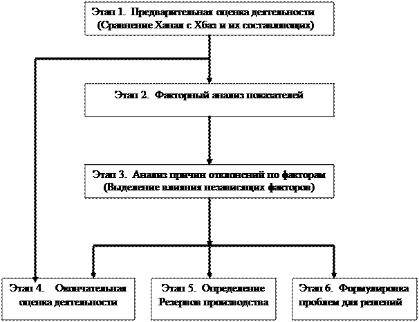 Экономический анализ может проводиться в две или одну стадии. В первом случае при проведении анализа различают предварительную и основную стадии (см. рис.1). На предварительной стадии выбираются обобщающие показатели, характеризирующие ту или иную анализируемую область, разрабатываются факторные модели показателей и формулы расчета влияния изменений факторов на изменение обобщающих показателей. При возможности на этой стадии необходимо определить потенциальные и прогрессивные уровни показателей, которые служат базой для определения потенциального и перспективного резерва деятельности. На основной стадии производят непосредственный факторный анализ обобщающих показателей. Во втором случае операции предварительной стадии производят по ходу выполнения основной стадии экономического анализа. Например, факторные модели показателей строятся в процессе выполнения факторного их анализа, потенциальный уровень анализируемого показателя определяют при расчете потенциального резерва и т.д. Основная стадия экономического анализа выполняется поэтапно. 1-й этап - предварительная оценка деятельности по обобщающему показателю, путем определения сравнения анализируемого (фактического) значения обобщающего показателя и его составляющих (по формуле расчета