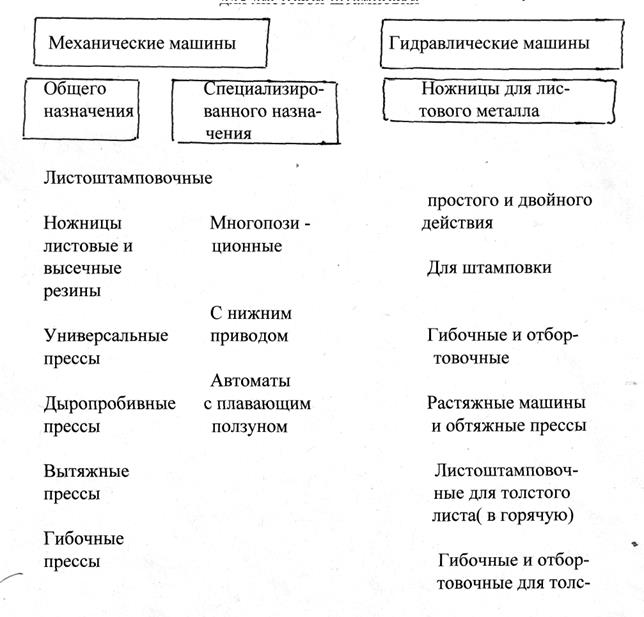 Листовая штамповка представляет собой процесс изготовления пластическим деформированием разнообразных по назначению, форме и размерам деталей из листовой заготовки в штампах. Оборудование для листовой штамповки подразделяют на механические прессы, гидравлические прессы, молоты, ротационные машины, автоматы, различные ножницы. Наибольшее применение в шамповочных цехах находят универсальные и специальные механические и гидравлические прессы и автоматы.