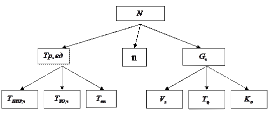 Следовательно, на первом уровне деления показателя выпуск продукции включает в себя следующие составляющие: количество основного оборудования, время работы единицы оборудования и часовая производительность оборудования. Дальнейшее деление показателя выпуск продукции производится по формулам расчета составляющих первого уровня его деления: а (n) - количество основного оборудования не разбивается на составляющие, т. к. оно являет исходным показателем, определяется технологическим регламентом на производство продукции и зависит от производственной мощности предприятия. К исходным показателям можно отнести и такие показатели, которые формируют две другие составляющие выпуска продукции, как: - календарный и режимный фонды времени оборудования, - простои оборудования в плановых ремонтах, - простои оборудования по технологическим причинам, - объем загрузки оборудования, - длительность цикла изготовления продукции, - коэффициент выхода готовой продукции. В тоже время длительность непланируемых простоев оборудования может быть разбита по причинам на составляющие (например, в связи с отсутствием сырья, энергии, невыхода рабочих, поломки оборудования и т.д.), которые являются исходными показателями. Эти показатели также можно ввести в факторную модель. Процедура деления промежуточных показателей на их составляющие заканчивается уровнем исходных показателей.