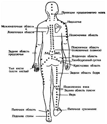 Рис. 4. Топография рефлексогенных зон на руке человека: 1 - лобные пазухи; 2 - зрение; 3 - слух; 4 - легкие; 5 - поджелудочная железа; 6 - надпочечники; 7 - сердце; 8 - почка; 9 - плечо, плечевой сустав; 10 - селезенка; 11 - толстая кишка; 12 - тонкий кишечник; 13 - прямая кишка; 14 - пояснично-крестцовый отдел; 15 - яичко, яичники; 16 - половой член, мочеточник, простат; 17- мочевой пузырь; 18 - позвоночный столб; 19 - шея; 20 - горло; 21– гипофиз. Следует рекомендовать больным воздействовать на эти зоны в форме самомассажа. Самомассаж проводится 2-3 раза в день по 3-5 мин. Методка выполнения самомассажа несложная. Применяются следующие приемы: 1)прямолинейное, спиралевидное и кругообразное растирание подушечкой большого пальца; 2)прямолинейное, спиралевидное и кругообразное растирание подушечками трех пальцев; 3) прямолинейное, спиралевидное и кругообразное растирание межфаланговыми суставами (пальцы сжаты в кулак). Шиацу Техника шиацу предполагает использование пальцев и ладоней рук для надавливания на отдельные участки поверхности тела, чтобы исправить различные телесные несоответствия и поддержать или активизировать здоровье человека. Также является методом, способствующим излечению «необычных болезней». Характерная черта шиацу — использование только пальцев, ладоней и особенно больших пальцев рук. Тем не менее отличительный признак шиацу — «сочетание диагностики и терапии». «Сочетание диагностики и терапии» — это умение практикующих врачей использовать свои сенсорные органы (ладони, пальцы и большие пальцы рук) для определения неровностей, таких как жёсткость поверхности тела, и сразу скорректировать или вылечить эти проблемы. Для того чтобы овладеть такой способностью, необходим большой опыт и практика. Шиацу не всегда до начала лечения требует предыдущей диагностики организма. В современной медицине курс лечения может быть проведён только после предварительной диагностики. В ТКМ также необходима диагностика до начала лечения. В шиацу - терапии практикующие врачи ускоряют профилактику и исцеляют от болезни посредством стимуляции иммунной системы и натуральных целебных свойств организма, которыми люди обладают от рождения. Поэтому даже без диагностики или при наличии языкового барьера практики могут ссылаться на Токудзиро Намикоси, когда принимают пациентов, используя при этом «большие пальцы руки и на тонком хлопчатобумажном матрасе», в любое время. Практикующие врачи говорят, что при лечении тела как целого они помогают восстанавливать физические функции нервной системы, сердечно - сосудистой системы, костной структуры, мускулов и эндокринной секреции, стимулируя предполагаемую врождённую способность организма лечить болезни. Это служит доказательством того, что квалифицированные практикующие врачи могут в большой степени содействовать региональному здоровью и консервативному лечению. Лечение остеохондроза главное для чего создано шиацу. При помощи шиацу остеохондроз излечим. Многие приходят к мануальному терапевту чтобы снять обострения остеохондроза. При этом они считают, что остеохондроз неизлечим. Но, как показывает практика, если не ограничиваться периодически только снятием обострений, а работать профилактически и систематически, остеохондроз так же излечим, как и многие другие заболевания. Шиацу — это многоуровневая 