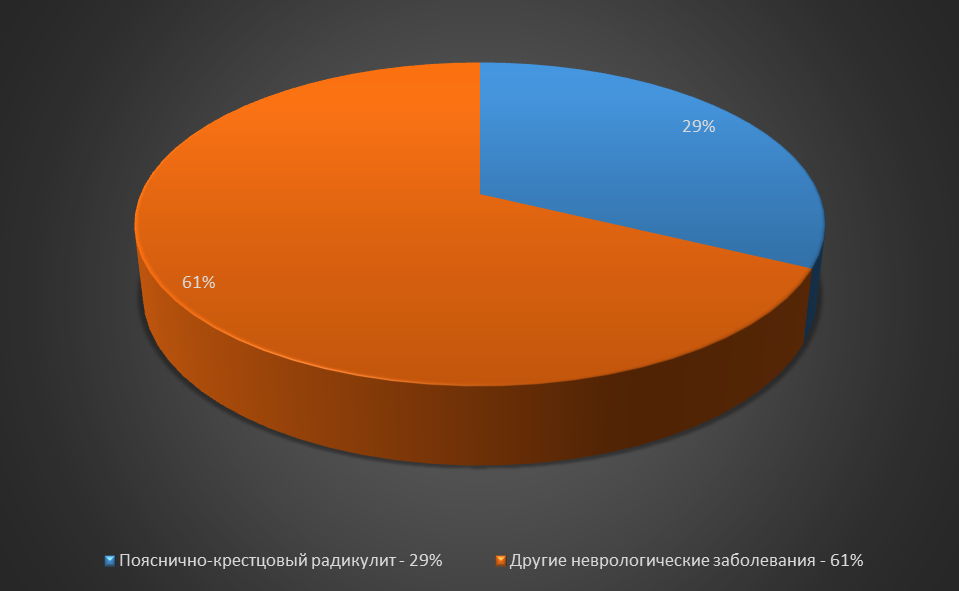 На основе полученных данных можно сказать, что пояснично-крестцовый радикулит составляет 29 % от всех неврологических заболеваний.