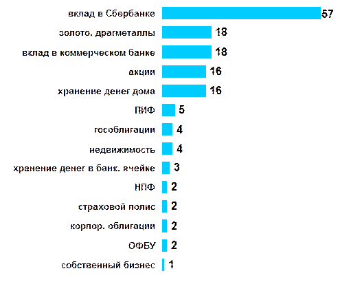 Структура сбережений граждан при их формальном разнообразии достаточно ограничена по факту. Среди наиболее распространенных форм организации сбережений, как показывает рисунок 7 являются на данный момент: вклад в Сбербанке или ином коммерческом банке, золото и драгоценные металлы, акции либо хранение денег дома.