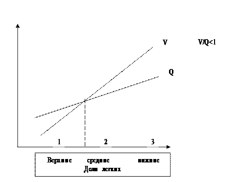 Влияние силы тяжести на вентиляцию и перфузии. Вентиляция сверху вниз ↑. Легкие растягиваются вниз и несколько в сторону max V на нижние доли приходятся. Кровоток (перфузия) сверху вниз ↑; Ргидр ↓ Рсердце