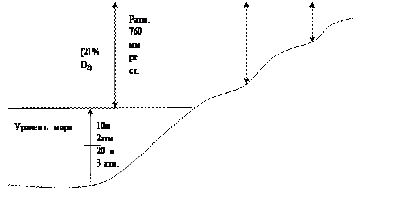 Ритм ↓ по мере подъема в гору. (% О2 в воздухе практически не изменяется), но в абсолютных цифрах рО2 по мере подъема ↓, т.к. ↓ Ратм. Весь слой атмосферы создает такое же давление как столб воды величиной в 10м. На высоте 3 км Ратм=523 мм рт ст; РО2. альвеол = 67 мм рт ст, насыщение крови О2 ≈ на 90%. На высоте 6 км Ратм = 349 мм рт ст; рО2 альвеол=67 мм рт ст насыщение О2. крови ≈ на 70% Для человека подъем на 2-3 км значительных изменений не приводит. Если поднялись выше 2-3 км → ↑ ДЦ => ↑ V => ↓ СО2.(↓ Н+), т.е. главного стимула для дыхания становиться все меньше => ↓ V, что приводит к резкому ↓ О2, “высотная болезнь” – слабость, отдышка, головные боли, потеря сознания (на высоте больше 4 км). Рецепторы, реагирующие на СО2 относятся к медленореагирующим => при медленном подъеме и тренировка можно подняться. Изменения, позволяющие нормально жить в горах: 1. ↑ V; 2. ↑ кол-во Er, а => и > Нb (до 220 мм.) 3. большая густота артериальной сети; 4. большая способность клеток к утилизации О2. Изменения, при погружении на глубину: Газы сжимаются на глубине => газы на глубине человеку тоже должны подаваться под давлением. При повышении Р азот может вызвать наркотическое состояние (влияет на липиды мембран, растворяясь в липидах ↓ влияния ЦНС); на глубине 45-60 м – сонливость; > 60 м – нарушения КБП. При повышенном давлении опасен и О2, т.к. в обычных условиях только ≈ 3% свободного О2 в крови, а при ↑ Р → растворимость газов в крови ↑ => ↑ содержание свободного О2. → ↑ радикально-окислительные процессы → нарушения ЦНС (судорги, тошнота, потеря зрения, кома). Декомпенсационная (кессонная) болезнь развивается по мере поднятия на высоту, т.к. растворимость газов в крови ↓ → газовая эмболия → тяжелые боли в мышцах, суставах, параличи. Для профилактики этих состояний используют специально разработанные схемы подъема (погружения). Механизм первого вдоха новорожденного. При перевязки пупочных сосудов резко ↓ рО2 и ↑ рСО2 → происходит стимуляция хеморецепторов (+ влияют рецепторы кожи, + активация всех аффрерR) → стимуляция дыхательного центра (а он в свою очередь находится в состоянии доминанты) → вдох.