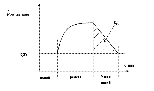 Момент излома кривой отражает физическую нагрузку, соответственно порогу анаэробного обмена (ПАНО). Величину ПАНО выражают в мощности работы или в величине потребляемого О2. Порог анаэробного обмена. Интенсивность физической нагрузки, при которой у испытуемого начинает развиваться метаболический ацидоз (т.е. мощность работы, при которой начинается активация анаэробного обмена).Чем позже, тем больше можно выполнить нагрузку. 3. кислородный долг- та часть О2, которая потребляется после физической нагрузки сверхпотребления О2 в покое (за такой же временный интервал до нагрузки). Во время выполнения работы потребление О2 ↑ и сохраняется повышенным относительно исходного уровня (постепенно ↓) в период восстановления после физической КД нагрузки.