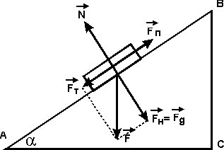 Коэффициент трения покоя зависит от характера обработки поверхности и от сочетания материалов, из которых состоят соприкасающиеся тела. Качественная обработка гладких поверхностей контакта приводит к увеличению числа притягивающихся атомов и соответственно к увеличению коэффициента трения покоя. Наблюдения показывают, что сила трения покоя всегда направлена противоположно действующей на тело внешней силе, стремящейся привести это тело в движение До определенного момента сила трения покоя увеличивается с возрастанием внешней силы, уравновешивая последнюю. Максимальное значение силы трения покоя пропорционально модулю силы Fд давления, производимого телом на опору По третьему закону Ньютона сила Fд давления тела на опору равна по модулю силе N реакции опоры. Поэтому максимальная сила трения покоя пропорциональна силе реакции опоры. Для модулей этих сил справедливо следующее соотношение: Fп=fпN, (1) где fп - безразмерный коэффициент пропорциональности, называемый коэффициентом трения покоя. Значение этого коэффициента зависит от материала и состояния трущихся поверхностей. Определить значение коэффициента трения покоя можно следующим образом. Пусть тело (плоский брусок) лежит на наклонной плоскости АВ(рис. 3, рис 4). На него действуют три силы: сила тяжести F, сила трения покоя Fп и сила реакции опоры N. Нормальная составляющая Fп силы тяжести представляет собой силу давления Fд, производимого телом на опору, т. е. FН=Fд. (2) Тангенциальная составляющая Fт силы тяжести представляет собой силу, стремящуюся сдвинуть тело вниз по наклонной плоскости. При малых углах наклона a сила Fт уравновешивается силой трения покоя Fп и тело на наклонной плоскости покоится (сила N реакции опоры по третьему закону Ньютона равна по модулю и противоположна по направлению силе Fд, т. е. уравновешивает ее). Будем увеличивать угол наклона a до тех пор, пока тело не начнет скользить вниз по наклонной плоскости. В этот момент Fт=Fпmax (3) Подставив в формулу (1) выражения (2) и (3), получим fп=Fт/Fн (4) Из рис. 3 видно, что Fт=Fsin Подставив эти значения Fт И Fн в формулу (4), получим fн=sin Измерив угол