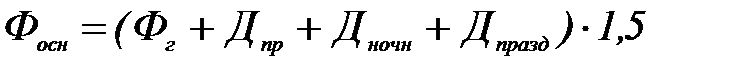 где Фг - дневная тарифная ставка, руб; Дпр .-премия, руб.; Дноч- доплата за работу в ночное время, руб.; Д празд - доплата за работу в праздники, руб. Ф осн=(258430, 2+64607, 55+34457, 36+5168, 60) ∙ 1, 5=543995, 57 Определяем дополнительный фонд заработной платы (за отпуск)