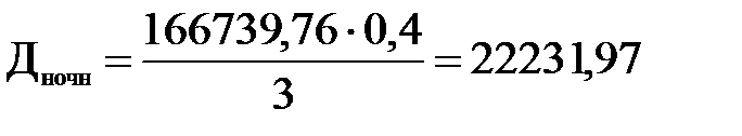 где Фг - дневная тарифная ставка, руб. Дпр =166739, 76∙ 0, 25=41684, 94 Определяем доплату за работу в ночное время. Принимаем 4, 76% от годового тарифного фонда