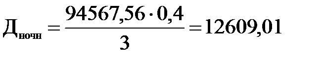 где Фг - дневная тарифная ставка, руб. Д пр=94567, 56∙ 0, 25=23641, 89 Определяем доплату за работу в ночное время. Принимаем 4, 76% от годового тарифного фонда