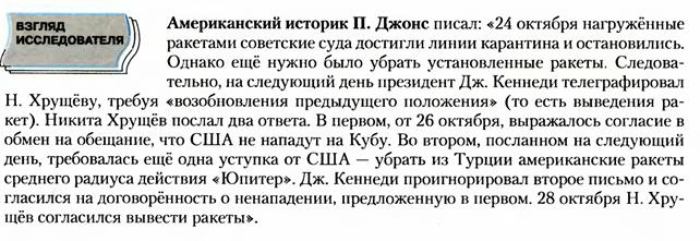 В январе 1959 г. в результате революции на Кубе к власти пришел Фидель Кастро, США отнеслись к этому отрицательно, разорвали дипломатические отношения и в 1961 г. поддержали высадку на территории Кубы контрреволюционных групп. Ф. Кастро обратился за помощью к СССР. На Кубе были установлены ядерные ракеты средней дальности, узнав об этом, президент США Джон Кеннеди объявил о введение морской блокады Кубы, все советские корабли, которые направлялись в Кубу, подлежали проверки, кризис продолжался с 22 по 28 октября 1962 г. Никогда опасность ядерной войны не была настолько близко.