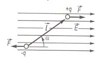 Рис.1.8 Отже, в однорідному електричному полі на диполь діє пара сил, яка намагається повернути диполь так, щоб кут між векторами р і Е зменшився і диполь встановився в напрямку поля. Існують два положення рівноваги диполя: - диполь паралельний електричному полю (стійка рівновага); - диполь антипаралельний йому (нестійка рівновага). Енергія диполя в однорідному електричному полі напруженістю Е: