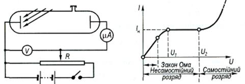 Іони та вільні електрони в іонізованому газі, як І нейтральні атоми та молекули, перебувають у постійному хаотичному русі. У разі зближення протилежно заряджених частинок вони з'єднуються між собою і утворюють нейтральні атоми та молекули. Цей процес називають рекомбінацією. Під час рекомбінації позитивного іона та електрона або двох іонів протилежних знаків звільняється енергія, яка витрачалась при їх іонізації. Якщо іонізація газу відбувається досить довго, то за відсутності зовнішнього електричного поля між процесами іонізації і рекомбінації встановлюється динамічна рівновага. Це означає, що кількість пар іонів, створюваних іонізатором за одиницю часу в одиниці об'єму газу, дорівнюватиме кількості нейтральних атомів і молекул, які утворюються в тому ж об'ємі газу за той самий час. Рекомбінація іонів супроводжується виділенням енергії здебільшого у вигляді світлового випромінювання, тому процеси, які відбуваються при рекомбінації, характерні світінням газу. 11.2. Несамостійний розряд у газах Явища, які пов'язані з проходженням електричного струму крізь газ і супроводжуються зміною стану газу (склад, тиск, енергетичні стани молекул тощо), називають електричним розрядом у газах. Залежно від механізму іонізації розряди в газах поділяють на несамостійні і самостійні. Електричний розряд вважають несамостійним, якщо він виникає тільки під дією іонізатора, а з припиненням його дії розряд зникає. Електропровідність газів досліджують за допомогою газорозрядної трубки (рис. 11.1) з двома електродами, наповненої досліджуваним газом. Напругу між електродами змінюють потенціометром. Іонізацію здійснюють довільним способом, наприклад, ультрафіолетовим або рентгенівським випромінюванням. Як видно з вольт-амперної характеристики електричного розряду (рис. 11.2), в газі при постійній потужності іонізатора спочатку зі зміною напруги U струм змінюється лінійно. З подальшим збільшенням напруги залежність I=f(U) набуває нелінійного характеру, а при U> U1, сила струму не залежить від напруги (Iн = const). Струм Iн називають струмом насичення. З підвищенням напруги U > U2 спостерігається значне зростання сили струму, яке супроводжується тепловими і світловими ефектами. Струм у газах при несамостійному розряді створюється напрямленим рухом іонів і електронів під дією електричного поля. Розглянемо несамостійний газовий розряд кількісно. Для спрощення вважатимемо, що газовий розряд відбувається між двома плоскими електродами, де концентрація позитивних і негативних іонів однакова (n+ = n_ = n); заряди позитивних і негативних іонів за абсолютним значенням дорівнюють зарядові електрона (q+ = q_ =\е\). У газових розрядах часто спостерігається нерівномірний розподіл іонів між електродами. При цьому градієнт концентрації їх dn/dx не дорівнює нулеві і виникає помітний дифузійний потік іонів.