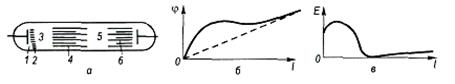 Рис. 11.4 Найпростішим і найбільш вивченим типом розряду, в якому газ перебуває в дуже не рівноважному стані, є тліючий розряд. Він спостерігається в газах при низьких тисках (близько 103 Па і менше). Тліючим розрядом називають самостійний розряд, в якому звільнення електронів з катода відбувається внаслідок бомбардування його позитивними іонами і фотонами, що утворюються в газі. Для спостереження розряду цього типу беруть скляну трубку 30—50 см завдовжки, в яку впаяно два електроди (рис 11.4, а). Коли напруга між електродами становить кілька сотень вольтів і тиск газу у трубці близько 7∙ 103 Па, виникає самостійний розряд у вигляді тонкої гнутої нитки, а при тиску близько 133∙ 10-1 —133∙ 10-2 Па розряд має вигляд, який схематично зображено на рис 11.4, а. Розрядний проміжок між катодом і анодом поділяється на ряд областей. Безпосередньо до катода прилягає вузький, так званий астоновий темний простір 1. У цьому шарі електрони, звільнені з катода, ще не набули енергії, достатньої для збудження атомів і молекул газу. Його ширина становить кілька десятих часток міліметра. До цього шару прилягає тонкий світлий шар 2, який називають катодним світінням. У цьому шарі відбувається збудження атомів і молекул електронами без іонізації їх. При переході в нормальний стан збуджені атоми випромінюють світло. За катодним шаром іде темний шар 3, який названо темним катодним простором або темним круксовим простором. У цьому просторі відбуваються іонізація атомів і молекул та наростання електронних лавин. Область темного катодного простору найважливіша для підтримання самостійного розряду, оскільки в ній утворюються позитивні іони, які й зумовлюють вторинну емісію електронів з катода. Світлий шар 4 називають тліючим світінням. Воно виникає внаслідок рекомбінації електронів з іонами, а також переходів атомів із збудженого стану в нормальний. Цей шар має різку межу з боку катода. Його яскравість поступово зменшується і переходить у так званий темний фарадеїв простір 5. Області 1 – 5 називають катодними частинами розряду. В них відбуваються всі процеси, внаслідок яких розряд є самостійним. За Фарадеєвим простором лежить світна область 6, яка досягає анода. Цю область називають позитивним світним стовпом. Іноді цей стовп розпадається на кілька шарів, або страт. Позитивний стовп — це іонізований газ, і його світіння зумовлене в основному рекомбінацією електронів з позитивними іонами. Наявність позитивного стовпа не впливає на підтримання самостійного розряду. Однак ця область найцікавіша з погляду застосування тліючого розряду. З'ясуванню характеру фізичних процесів, які відбуваються в кожній області тліючого розряду, допомагають криві розподілу потенціалу φ і напруженості електричного поля Е вздовж розрядної трубки l (рис. 11.4, б, в). Оскільки в позитивному стовпі хід залежності потенціалу від l лінійний, а напруженість постійна, то з цього випливає висновок, що концентрації позитивних і негативних зарядів є однаковими. Якщо в газорозрядній трубці зробити анод рухомим, то під час його переміщення до катода катодні області розряду 1 – 5 залишатимуться без змін, а позитивний стовп буде скорочуватись до повного зникнення його. З подальшим переміщенням анода в тліючий шар світіння зникає зовсім. Розряд припиняється, коли анод буде на межі просторів 1 і 2. Дослід п