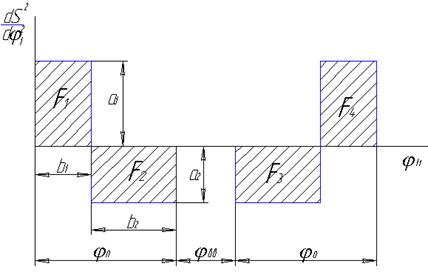Проектирование кулачкового механизма начинают с построения кинематических диаграмм аналогов ускорения и скорости, а также перемещения. Исходными данными для построения диаграмм могут быть заданный закон изменения аналога ускорения, максимальное и минимальное значение аналога ускорения (или их отношение), рабочий угол профиля кулачка, фазовые углы, угловая скорость кулачка. По данным для проектирования строится диаграмма изменения аналогов ускорений. По оси ординат желательно отложить отрезок, изображающий максимальное значение аналога ускорения, равный 70-80 мм. По оси абсцисс откладывается рабочий угол профиля ведущего звена кулачка. Рекомендуется принять отрезок l j, изображающий рабочий угол профиля кулачка, равным 180-300 мм. В том случае, когда задано отношение максимального ускорения к минимальному v = а1/а2, а углы подъёма и опускания равны, и законы для них одинаковы, то при построении диаграммы необходимо учесть, равенство площадей Ft= F2=F3= F4, (рис. 3), т. е. a1/a2 = в2/в1 .