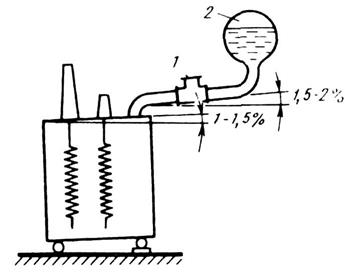 Газовая защита Принцип действия и устройство газового реле. Газовая защита получила широкое распространение в качестве весьма чувствительной защиты от внутренних повреждений трансформаторов. Повреждения трансформатора, возникающие внутри его кожуха, сопровождаются электрической дугой или нагревом деталей, что приводит к разложению масла и изоляционных материалов и образованию летучих газов. Будучи легче масла, газы поднимаются в расширитель 2, который является самой высокой частью трансформатора (рис. 16.42) и имеет сообщение с атмосферой. При интенсивном газообразовании, имеющем место при значительных повреждениях, бурно расширяющиеся газы создают сильное давление, под влиянием которого масло в кожухе трансформатора приходит в движение, перемещаясь в сторону расширителя. Таким образом, образованиие газов в кожухе трансформатора и движение масла в сторону расширителя могут служить признаком повреждения внутри трансформатора. Эти признаки используются для выполнения специальной защиты при помощи газовых реле, реагирующих на появление газа и движения масла. Газовое реле 1 устанавливается в трубе, соединяющей кожух трансформатора с расширителем так, чтобы через него проходили газ и поток масла, устремляющиеся в расширитель при повреждениях в трансформаторе. В трубе предусмотрена задвижка, которая закрывает ее автоматически при срабатывании газовой защиты, предотвращая поступление масла из расширителя в бак поврежденного трансформатора (для ограничения пожара в баке).