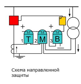 Обратимся к рисунку: при повреждении в точке К1 ток КЗ будет протекать с шин ПС/2 и ПС/3 в точку замыкания. При этом, защиты 4 и 5 должны своевременно отключить Л-2. Однако на шинах этих же подстанций расположены защиты 3 и 6, которые не должны действовать, так как это приведет к излишнему отключению Л1 и Л3. Избирательную работу защит в этом случае обеспечивает орган направления мощности, который сравнивает фазу напряжения и тока КЗ Направление тока от шин в линию считается условно положительным, в этом случае реле мощности разрешает отключать контролируемый участок. Направление из линии в шины считается условно отрицательным, происходит пуск защит, но команда не реализуется, поскольку реле мощности не работает на отключение. Так как направленная защита должна реагировать не только на величину, но и на направление тока КЗ, применяют реле мощности включаемое по приведенной ниже схеме.