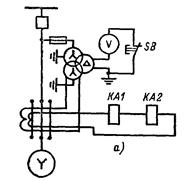 Мвр=kUpIp*sin(α –φ p). Вектор тока Ia может совпадать с вектором напряжения Ubc при чисто реактивном сопротивлении линии, тогда ток принимает значение I’a (см. рис). При чисто активном сопротивлении линии вектор тока Ia отстает от вектора напряжения на 90° (на рис. I’’a). Угол сдвига между Ubc и Ia равен φ р=–(90-φ к)°, а его предельные значения колеблются в зависимости от φ к от 0° до 90°. Прямая N1N2 - это линия изменения знака момента реле, а М1М2 линия максимального момента реле. Изменение величины φ р в пределах от 0 до 90 ведет к срабатыванию реле, так как момент находится в области положительных значений (синее поле). При отклонении φ р за пределы 0 и 90, момент меняет свое значение на отрицательное и срабатывания не происходит. Раскройте содержание следующих терминов: Защита генераторов. Защита от однофазных замыканий статора. Токовые защиты от внешних КЗ и перегрузок. Защита от повышения напряжения. Защита от однофазных замыканий статора. Поскольку токи замыкания на землю малы по сравнению с токами, проходящими при многофазных КЗ, защита генератора от замыканий на землю должна иметь высокую чувствительность. Поэтому токовые реле защиты от замыканий на землю подключаются к специальным трансформаторам тока нулевой последовательности, которые обеспечивают работу защиты при малых токах замыканий на землю. Схема защиты генератора с ТНП и ТНПШ от замыканий на землю в обмотке статора приведена на рис. 3.4, а. Токовое реле КА1 типа РТ-40 включено на вторичную обмотку ТНП. Чтобы предотвратить неправильное действие защиты от токов небаланса, проходящих кратковременно во время переходных процессов при замыкании на землю во внешней сети, в схему введено реле времени, создающее выдержку времени 0, 5—2 с В схеме защиты предусмотрен вольтметр с кнопкой, с помощью которого можно примерно определить число замкнувшихся витков при замыкании на землю в обмотке статора. Чем дальше от нулевой точки генератора возникнет замыкание на землю, тем больше будут показания вольтметра. По вольтметру можно также обнаружить замыкание на землю обмотки статора до включения генератора в сеть, когда защита с ТНП работать не будет. Рис. 3.4. Схемы защиты генератора от замыканий на землю: а -- токовые цепи, б — цепи оперативного тока. На рис, 3.4 показано также токовое реле КА2, которое предназначено для действия при двойных замыканиях на землю (одно замыкание на землю во внешней сети генераторного напряжения, а второе — в обмотке статора). Реле КА2 действует без выдержки времени на выходное промежуточное реле генератора через указательное реле КН2. Ток срабатывания чувствительного реле защиты от замыканий на землю должен удовлетворять следующим условиям: а) быть не выше 5 А, чтобы обеспечить отключение генератора при токах замыкания на землю 5 А и выше б) быть больше тока небаланса, проходящего через ТНПШ при внешнем двухфазном КЗ. Для определения первичного тока срабатывания защиты можно воспользоваться следующим приближенным выражением: где I с, г—собственный емкостный ток генератора; Назначение и виды защит от внешних КЗ. Защита генераторов от внешних КЗ служит для отключения генераторов при повреждениях на сборных шинах электростанций или на отходящих от них присоединениях при отказе РЗ или выключателей этих элементов. В тех случаях, когда сборные шины генераторного напряжения 