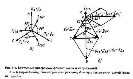 Таким образом, ток I з(C) равен утроенному значению нормального емкостного тока фазы I ф(C) = U ф /X C. Из рис.9.2, б видно, что ток I з(C) опережает от U N на 90°. Ток I з(C) может быть определен по формуле