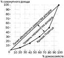 | график, по оси Х - % домохозяйств, по оси У - % совокупного дохода. Чем ближе график к прямой (линии абсолютного равенства доходов), тем меньше имущественная дифференциация