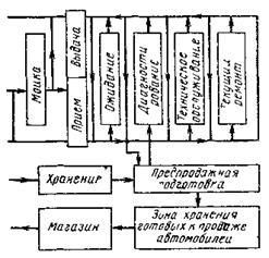 Организация работ на участках ТО и ремонта определяется объемом производственной программы и суточным количеством автомобиле – заездов по однородным видам работ и предусматривает следующий порядок. Автомобили, прибывающие на станцию для проведения ТО и ремонта, проходят мойку и поступают на участок приемки для определения технического состояния, необходимого объема работ и их стоимости. Если на станции обслуживания производится продажа автомобилей, то поступающие автомобили направляются на участок предпродажной подготовки, а оттуда в зону хранения и магазин (рис. 8.3).