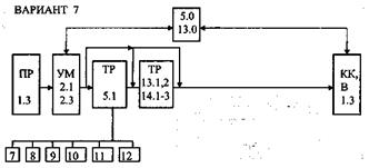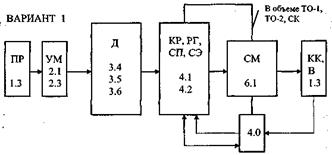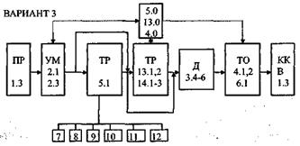 Рис. 8.3. Функциональная схема станции технического обслуживания После приемки автомобиль направляют на соответствующий производственный участок. В случае занятости рабочих постов, автомобиль поступает на автомобиле–места ожидания или хранения, а оттуда, по мере освобождения постов, направляется на тот или иной производственный участок. После завершения работ автомобиль поступает на участок выдачи. Метод контроля предусматривает разделение работ ТО и ТР на три группы: 1. не требующие предварительного диагностирования с помощью стендов и приборов, например такие, как крепежные, смазочные и др.; 2. устанавливаемые визуально внешние неисправности и повреждения кузова; 3. требующие применения специальных стендов и приборов для выявления скрытых неисправностей в агрегатах без их разборки. Контроль и устранение выявленных неисправностей при выполнении работ по системам и механизмам последней группы, обеспечивающим безопасность движения, согласовывают с клиентом и проводят при каждом заезде автомобиля в, а не только при ТО – 1 и ТО – 2. После мойки, приемки и диагностики автомобиль поступает непосредственно в зону технического обслуживания и ремонта, ТО и ТР, где работы распределяются в зависимости от вида и метода организации по различным производственным участкам, затем – на участок контроля и выдачи. При необходимости качество работ определяют на постах диагностики. Когда посты диагностики и приемки заняты, а владелец автомобиля отсутствует, автомобиль поступает на автомобиле – место ожидания. При организации работ на СТО владелец автомобиля пользуется правом проведения выборочных работ из объема ТО и ТР в любом сочетании, обязательным при этом являются предшествующие моечно – уборочные работы. Предусматривается также, что владелец автомобиля может заявить о необходимости выполнения дополнительного диагностирования. Проведению работ ТР должно предшествовать выполнение работ по ТО. Типовые виды работ, выполняемые на СТО, условно обозначают индексами: ПР – приемка и проведение осмотровых работ; УМ – уборочно – моечные работы; Д – диагностические работы; ТО – техническое обслуживание, в том числе: КР – крепежные работы; РГ – регулировочные работы; СП – работы по системе питания; СЭ – работы по системе электрооборудования; СМ – смазочные работы; ТР – работы текущего ремонта, специализированные участки внепостовых работ 7... 12; КК – контроль качества выполнения работ; В – выдача автомобилей владельцам. Характерные варианты возможного сочетания видов и комплексов работ по ТО и ТР автомобилей и их рациональной организации (рис.2.2): 1 – ТО в полном объеме; 2 – выборочные работы ТО по согласованию с заказчиком; 3 – ТО в полном объеме и ТР по потребности, диагностика после ТР для проверки качества; 4 – выборочные работы ТО и ТР по заказу владельца; 5 – ТО в полном объеме и ТР по результатам диагностики; 6 – аналогично варианту 5, но с ограничением объема ТО по заявке владельца; 7 – работы ТР по заявке владельца без диагностики; 8 – диагностика и необходимые по ее результатам работы ТР.