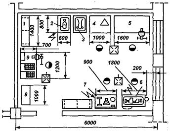 Рис. 6.10. Планировка зоны производственного участка 1. Между боковыми и тыльными сторонами оборудования 2. Между оборудованием при расположении попарно 3. От стены, колонны до тыльной или боковой стороны оборудования 4. От стены, колонны до фронтальной стороны оборудования Таблица 4.3. Нормируемые расстояния для размещения слесарного оборудования, мм