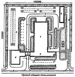 На планировке должно быть показано местоположение колонн, стен, перегородок, лестниц, оконных и дверных проемов, а также ворот для въезда и выезда автомобилей. На планировке помещений над основной надписью приводится экспликация помещений, заполнение которой производится сверху вниз. На технологической планировке участков и рабочих постов необходимо указать: строительные оси здания и расстояния между ними в соответствии с общей планировкой; привязку оборудования и оргоснастки к строительным осям или элементам конструкции здания, чтобы по данной планировке можно было произвести расстановку и монтаж стационарного оборудования; рабочие места, потребители воды, электроэнергии, сжатого воздуха и т. д. в соответствии с принятыми условными обозначениями; спецификацию технологического оборудования и оргоснастки. Генеральный план предприятия Генплан предприятия – это план отведенного под застройку земельного участка территории, ориентированный в отношении проездов общего пользования и соседних сооружений, с указанием на нем зданий по их габаритному очертанию, площадки для безгаражного хранения, основных и вспомогательных проездов и путей движения подвижного состава по территории. СТО следует располагать поблизости от транспортных магистралей, в центре обслуживаемого районе. Территория станции должна быть изолирована от городского движения транспорта и пешеходов (рис. 2.5).
