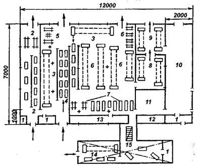 Рис. 2.3. Планировка производственного корпуса При расположении СТО в двух зданиях в одном из них рекомендуется располагать административные, торговые, бытовые и прочие помещения, посещаемые клиентами, а в другом – помещения производственного назначения. На СТО с количеством постов до 10 допускается выполнять в одном помещении с постами ТО и ТР работы: по ремонту двигателей, агрегатные, слесарно – механические, электротехнические, по ремонту и изготовлению технологического оборудования, приспособлений и оснастки. На станциях обслуживания основным помещением является зона постовых работ ТО и ТР, которая связана со всеми производственно – складскими помещениями. выделяются самостоятельные участки УМР, ремонта кузовов и окраски, противокоррозионной обработки. помещение приема заказов (клиентская), помещение продажи запчастей, касса и посты приема и выдачи автомобилей располагаются смежно. К постам приемки и выдачи обычно примыкает участок диагностирования. Клиентскую и участок диагностики желательно располагать рядом. Перечисленный блок помещений является головной частью станции, куда клиент имеет свободный доступ. В этой части обычно располагаются основные рабочие въезды и выезды. В зонах ТО и ТР, диагностики и текущего ремонта схематично изображается применяемое оборудование (канавы, подъемники, конвейеры, диагностические стенды, моечные установки, окрасочно – сушильные камеры и др.). Посты для ТО и ТР, автомобиле – места хранения и посты ожидания наносятся на плане штрих – пунктиром по габаритному очертанию автомобилей с указанием его передней части и соблюдением нормативных расстояний. На плане стрелками указываются пути движения автомобилей в соответствии с последовательностью технологического процесса. При оформлении плана следует указывать основные строительные размеры (шаг и пролеты колонн, габаритные размеры здания), маркировку строительных осей, нормируемые технологические расстояния на постах ТО и ТР между автомобилями, а также между автомобилями и элементами здания, угол расстановки постов, ширину проездов. Размеры проставляются в миллиметрах. Нумерация помещений на планировке сквозная, слева направо по часовой стрелке в возрастающем порядке. Расстановка технологического оборудования и оргоснастки постов ТО и ТР на планировках зон и участков должна выполняться в соответствии со схемой технологического процесса, с учетом необходимых условий техники безопасности (рис. 2.4).