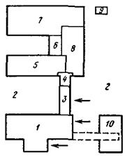 Рис. 2.17. Схема деблокированной компоновки СТО: 1 – зона быстрого,: ТО; 2 – зоны ожидания (открыты естоянки); 3 – приемный пункт; 4 – бюро технических служб; 5 – мастерская механических работ; 6 – бытовой узел; 7 – кузовная мастерская; 8 – склад запасных частей; 9 – центральная станция энергетического хозяйства; 10 – пункт продажи новых автомобилей