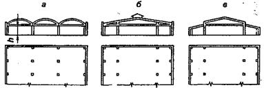 Рис. 6.11. Схемы конструкций производственных зданий В ряде случаев исходя из технологических соображений используют схему, в которой применяются центральный пролет и боковые разной высоты (рис. 6.11, в). За счет перепада высот здесь возможно и естественное освещение. Объемно – планировочное решение многоэтажных зданий базируется на двух типах зданий – единой и смешанной этажности (рис. 5.7). Многоэтажная часть здания предназначена в основном для помещений хранения автомобилей, а одноэтажная часть – для производственных помещений.