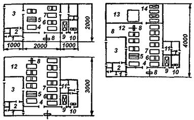 Рис. 2.8. Схема развития комбинированной СТО: а, б, в – этапы развития; 1 – клиентская; 2 – контора; 3 – склад; 4 – зона ТО и ТР; 5 – пост ТО и регулировки узлов установки колес; б – пост на двухстоечном подъемнике; 7 – напольный пост; 8 – тормозной стенд; 9 – зона быстровыполняемого ТО (мойки, смазывания, заправки); 10 – мощностной стенд; 11 – бытовые помещения; 12 – агрегатно – механическое отделение; 13 – ремонтно – кузовное и окрасочное отделения; 14 – пост на гидроподъемнике рабочие посты и другие автомобиле – места, которые являются типовыми унифицированными элементами с определенной площадью, составом оборудования и функциями (рис. 2.9).