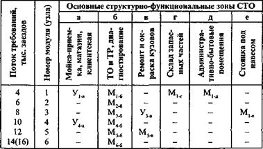 Модульно – секционный метод проектирования и развития СТО предусматривает не только технологическую типизацию и унификацию составляющих ее элементов, но и архитектурно – строительную. Объемно – планировочно СТО должна формироваться и развиваться дискретно, четко определенными геометрическими частями – секциями или блоками (пространственная комбинация двух или нескольких секций). Для практической реализации метода должно соблюдаться одно из следующих условий: типовой технологический модуль по площади и геометрическим параметрам входит в строительную секцию (блок) кратное число раз; модуль состоит из двух или нескольких строительных секций; модуль (узел) равен строительной секции (блоку). Таблица 2.15 Типы модулей (узлов), используемых при формировании СТО разной мощности и назначения в зависимости от величины и характера потока требований